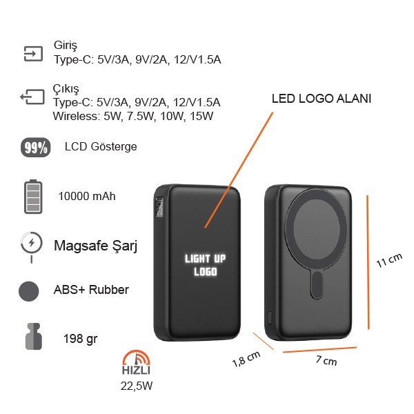 10000 mAh Magsafe IŞIKLI 22.5W Hızlı Sarjlı 15W Hızlı Wireless Powerbank K45