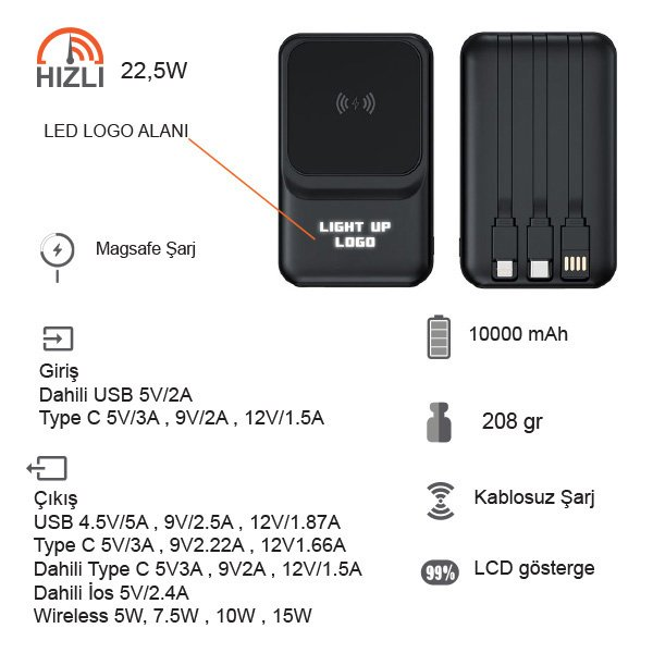 10000 mAh Magsafe ıŞIKLI 22.5W Hızlı Sarjlı 15W Hızlı Wireless Powerbank K35